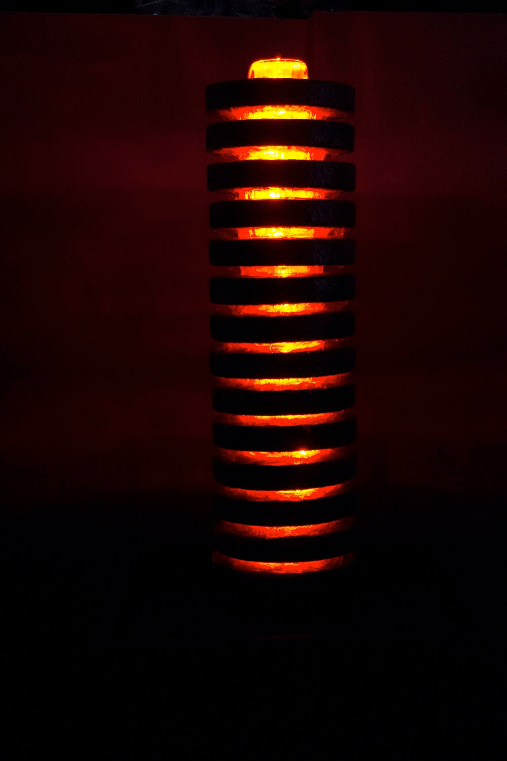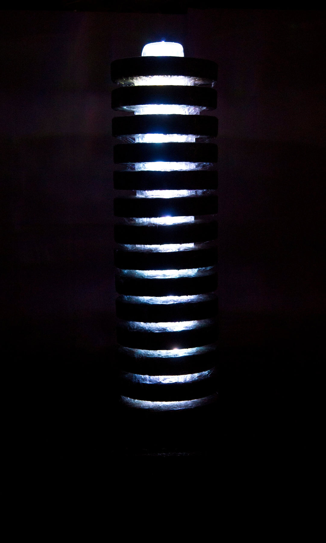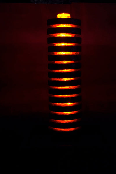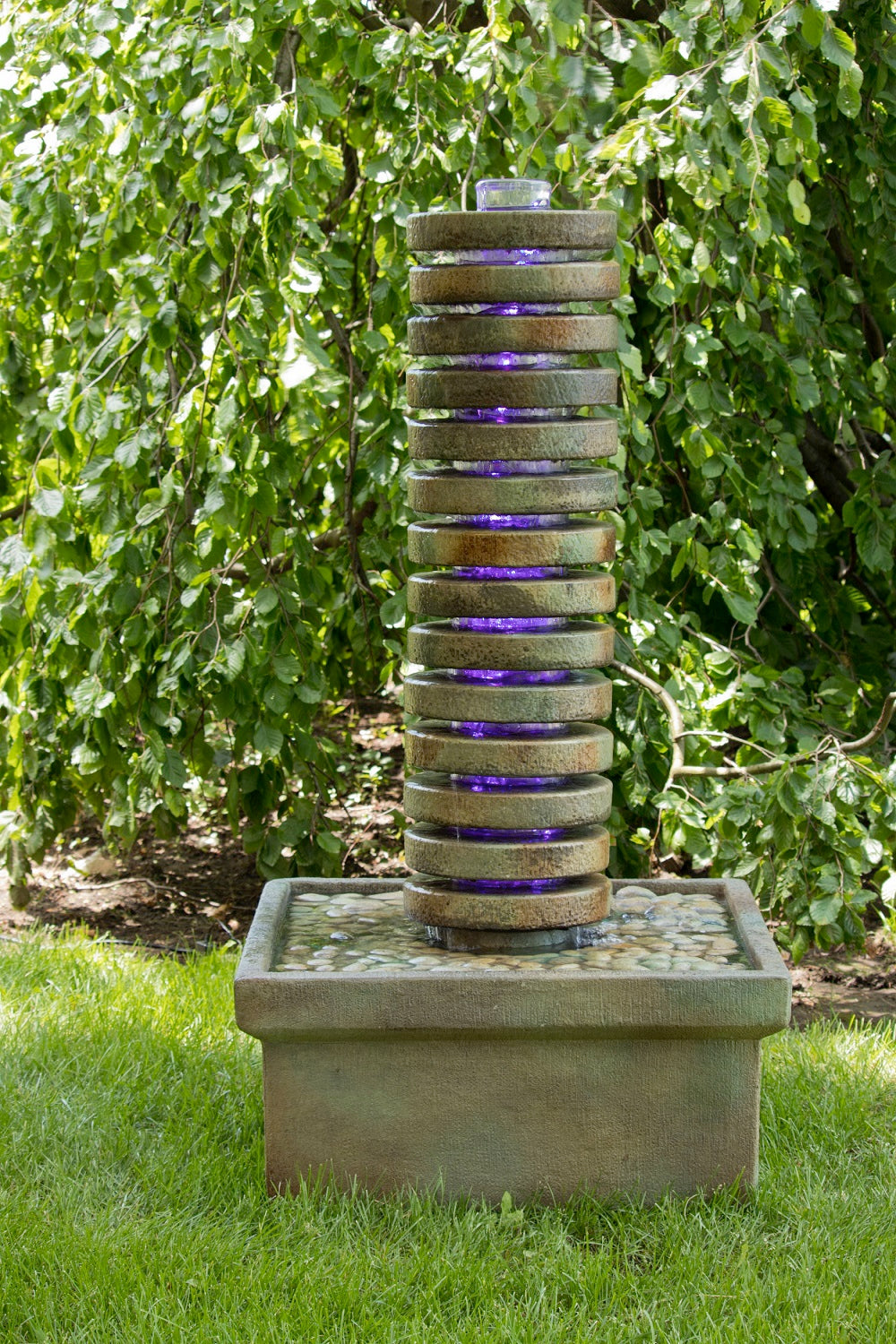 The Round Luminaire Fountain elevates fountaineering to new heights. Fourteen disks, stacked and separated by acrylic rings provide a literal floating experience. Changeable central lighting in white, orange, green and blue allows for just the right nighttime experience. A brilliant underwater LED light kit is included for a shimmering night-time effect.