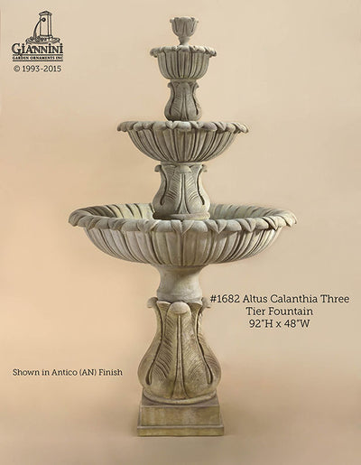 This outdoor fountain is available in 17 Different Finishes. Every finish is hand applied during the production process so color variation is expected. When the finish is applied to the water feature it is designed to replicate the look of naturally aged materials.