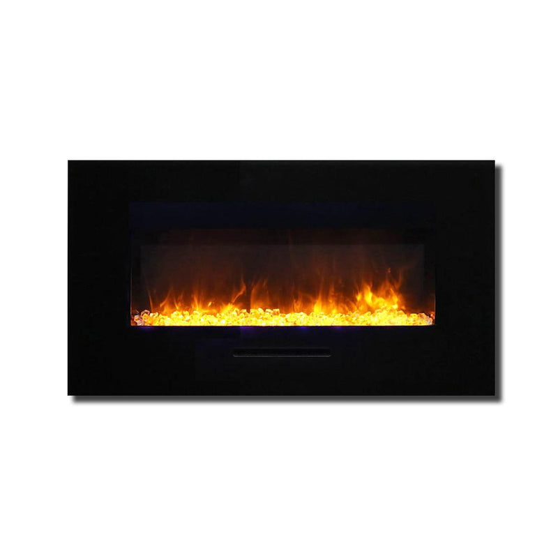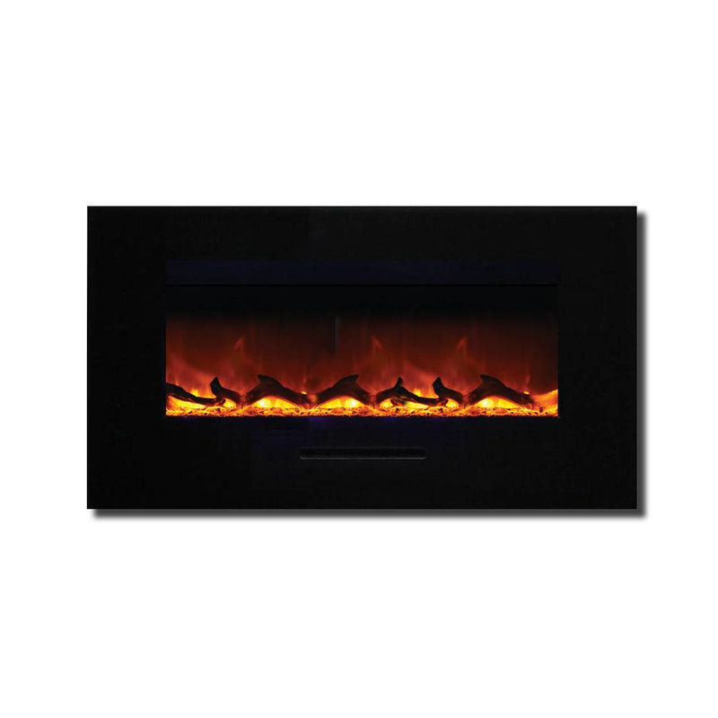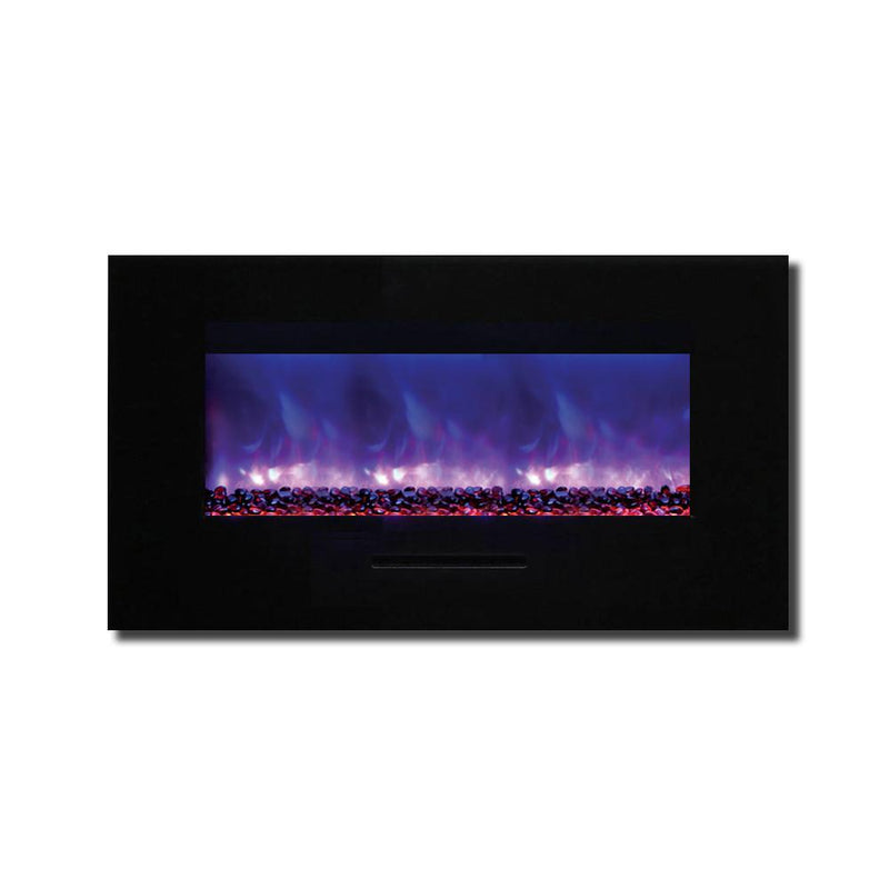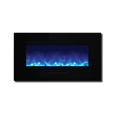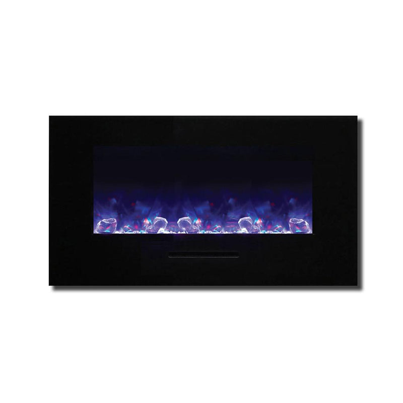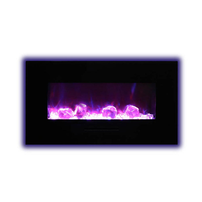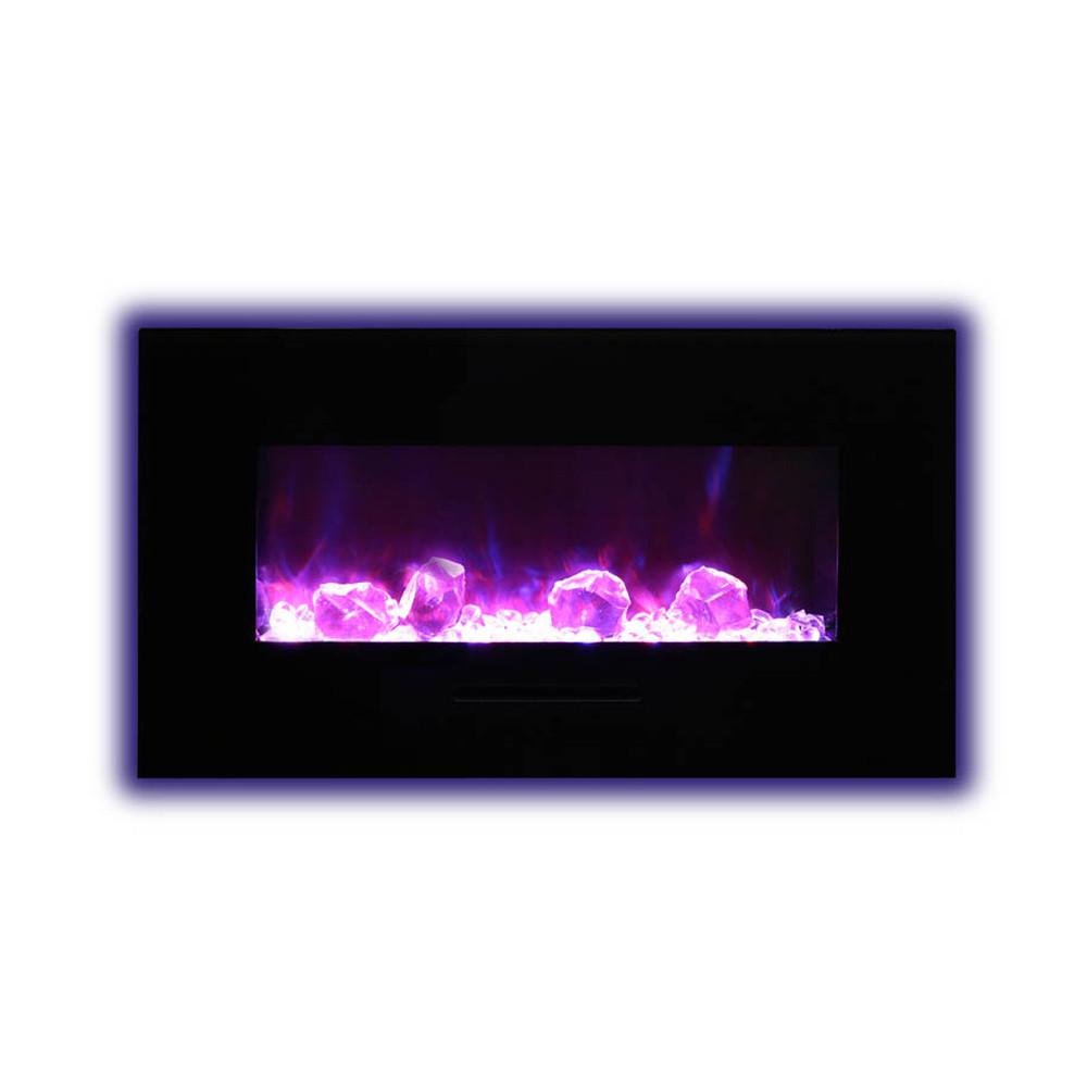 Unleash a kaleidoscope of fire from the palm of your hand with the Amantii 34″ Wall Mount/ Flush Mount Smart Electric Indoor / Outdoor Fireplace. This compact marvel (23"H x 43 1/2"W x 6 3/4"D) boasts a captivating 31" x 10" glass view, ready to become your personal canvas for firelight dreams. Ignite the unexpected: with a click on your smartphone via the intuitive app (available on Google Play and Apple App Store), transform traditional yellow and orange flames into contemporary hues of blue, purple, rose, and violet. Effortless placement: wall mount or built-in flush with included brackets, making it ideal for any space, indoors or outdoors. Warmth on demand: enjoy discreet heating (up to 500 sq. ft.) emitted from the black glass surround, independent of the dancing flames. Personalize your haven: choose from 13 vibrant back-lighting colors for the surround and explore optional decorative media like driftwood logs, EMBERs, or FIRE & ICE®. This isn't just a fireplace, it's a portal to endless firelight possibilities.