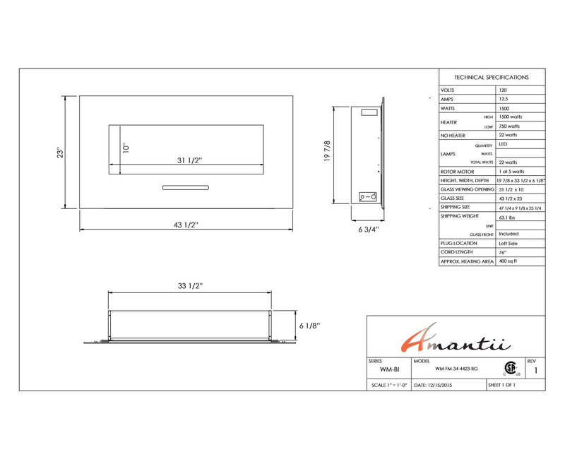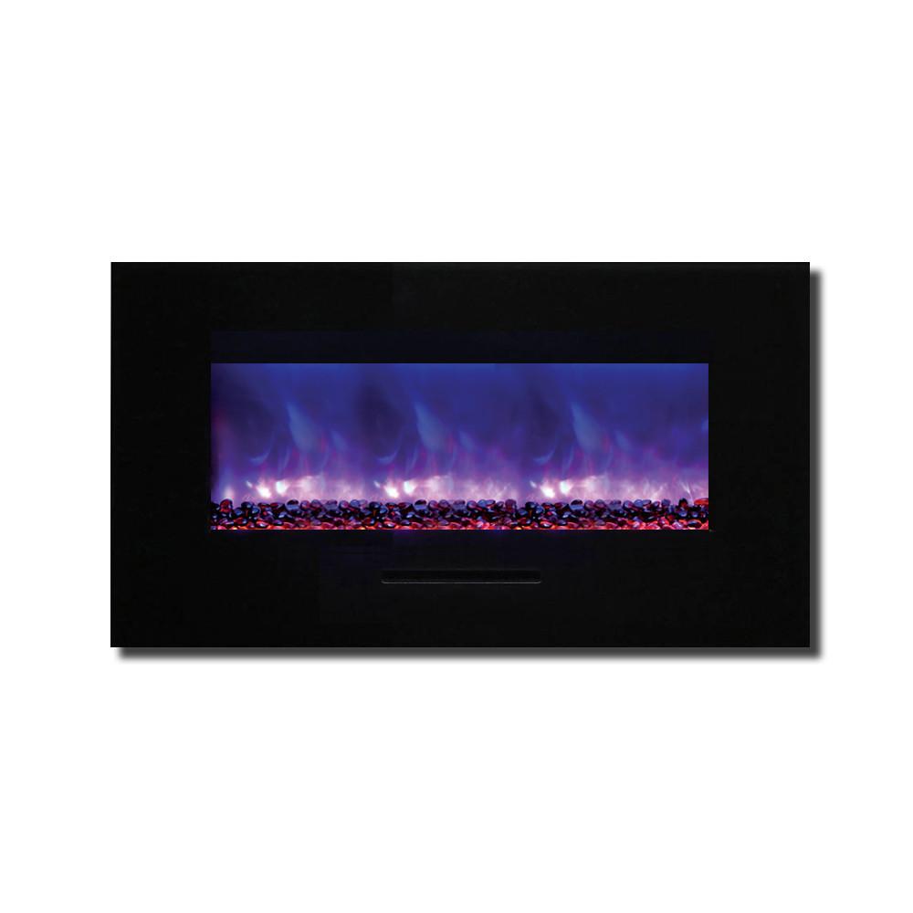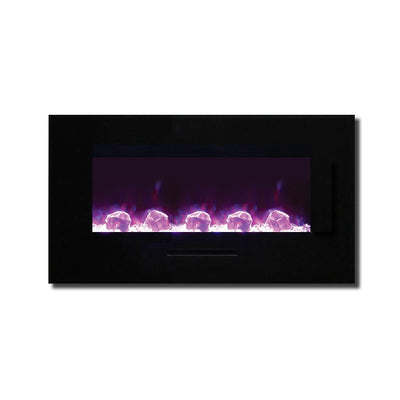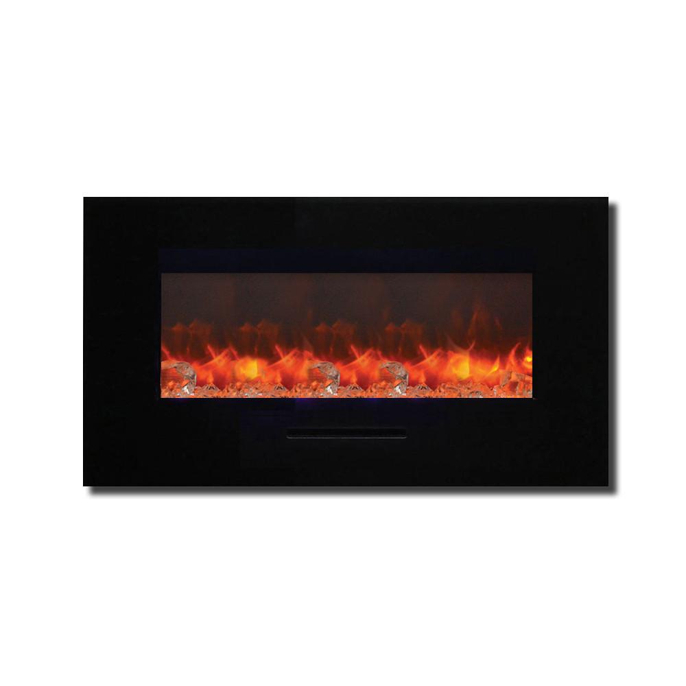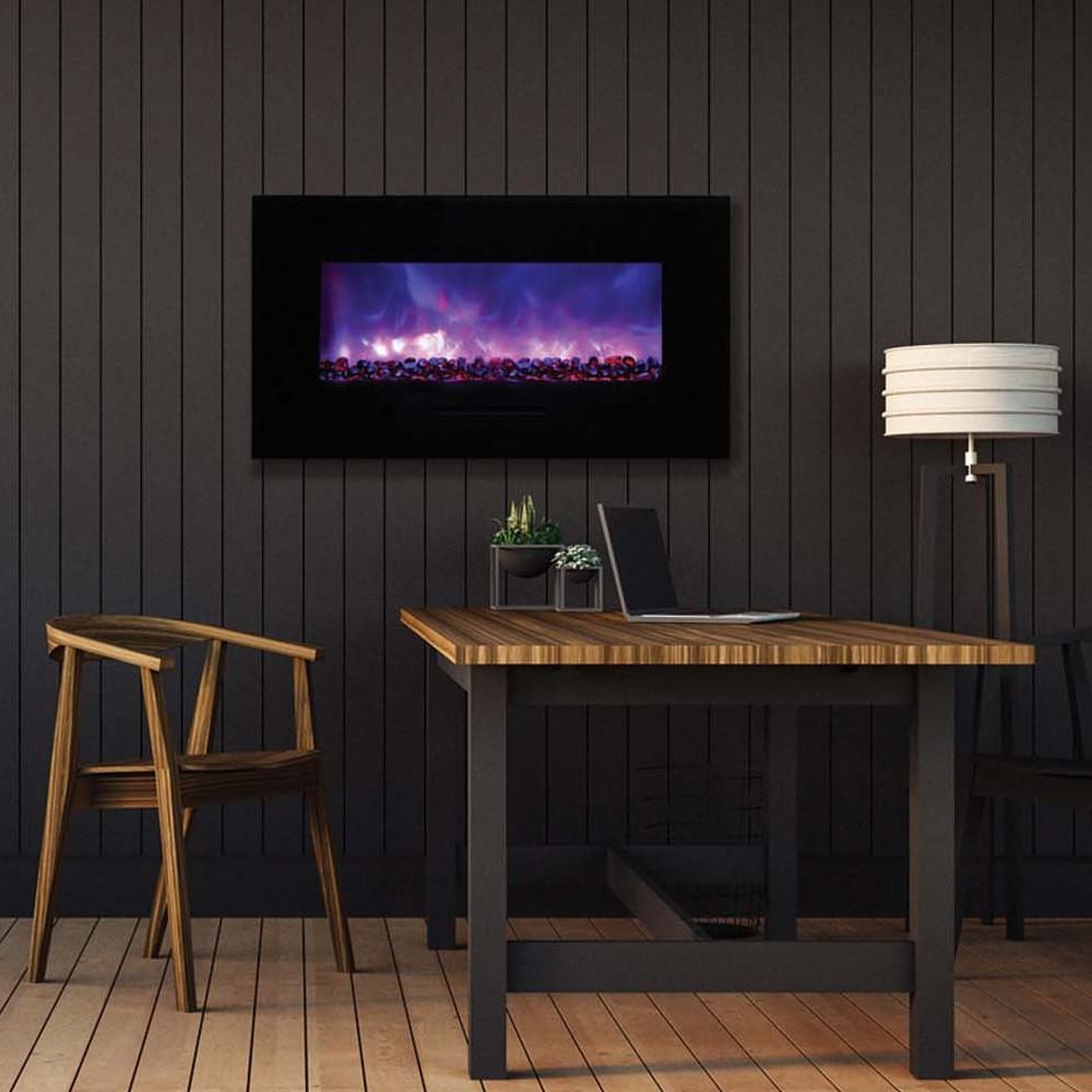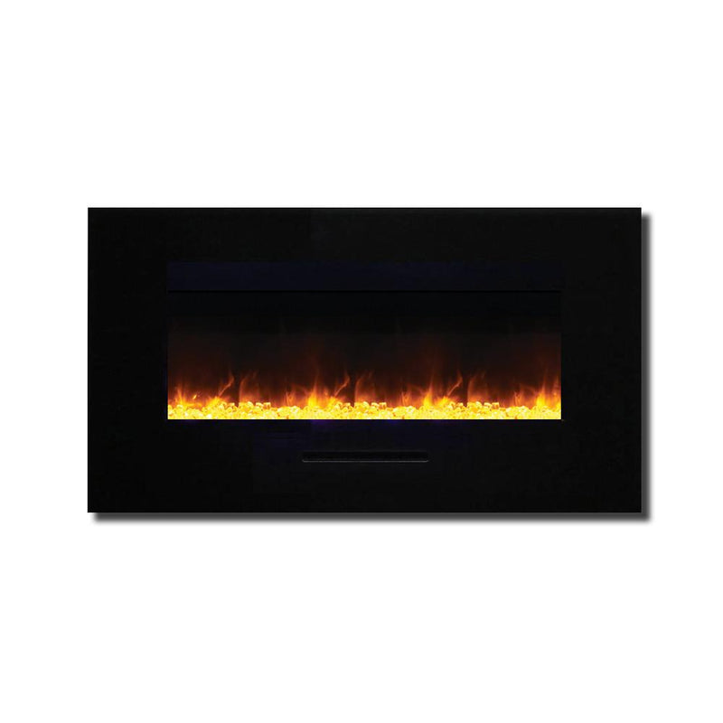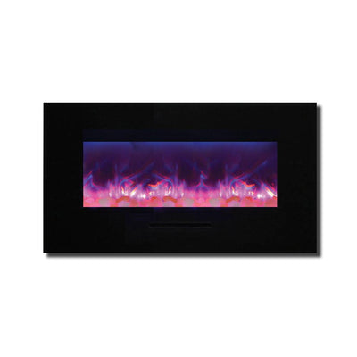 Unleash a kaleidoscope of fire from the palm of your hand with the Amantii 34″ Wall Mount/ Flush Mount Smart Electric Indoor / Outdoor Fireplace. This compact marvel (23"H x 43 1/2"W x 6 3/4"D) boasts a captivating 31" x 10" glass view, ready to become your personal canvas for firelight dreams. Ignite the unexpected: with a click on your smartphone via the intuitive app (available on Google Play and Apple App Store), transform traditional yellow and orange flames into contemporary hues of blue, purple, rose, and violet. Effortless placement: wall mount or built-in flush with included brackets, making it ideal for any space, indoors or outdoors. Warmth on demand: enjoy discreet heating (up to 500 sq. ft.) emitted from the black glass surround, independent of the dancing flames. Personalize your haven: choose from 13 vibrant back-lighting colors for the surround and explore optional decorative media like driftwood logs, EMBERs, or FIRE & ICE®. This isn't just a fireplace, it's a portal to endless firelight possibilities.