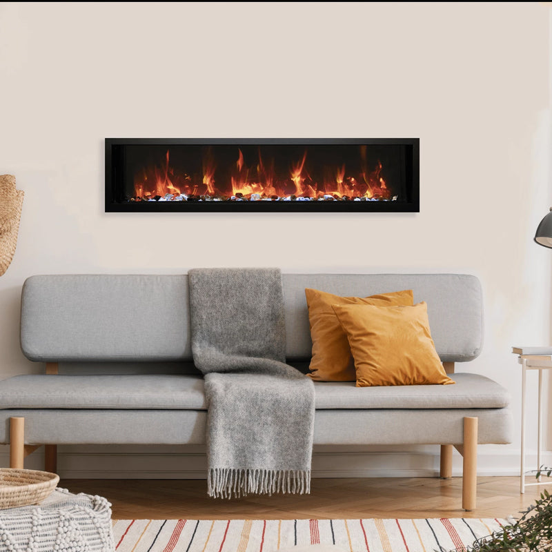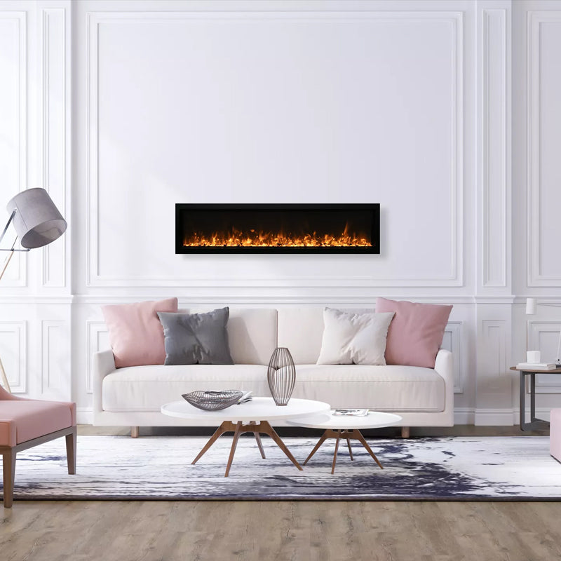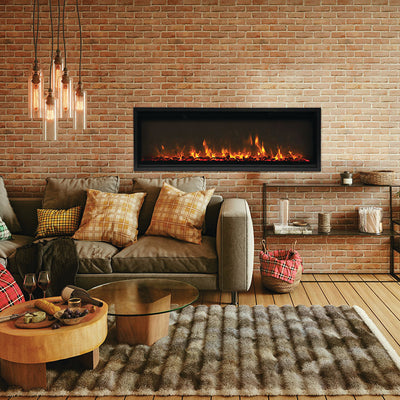 Embrace the symphony of fire and technology with the Amantii Symmetry XtraSlim Smart 60" Electric Fireplace (15 3/8″"H × 60 1/2″W × 4 1/8″D). This sleek marvel boasts a panoramic viewing area (10 3/4”H x 58 1/8”W), showcasing lifelike flames in shades of yellow, orange, and red at your command. Control it all from anywhere: use the WiFi app to set schedules, adjust flame speed and color, or let the weather trigger its automatic warmth (up to 5118 BTU!). No limitations to your design: seamlessly mount or recess it into any 2 x 4 wall for a clean, modern look. Year-round enjoyment: bask in the mesmerizing flames with or without heat, making it perfect for any season. Convenience reigns supreme: control everything from the included remote, smartphone app, or WiFi, even adjusting the 11 multi-color uplighting for a personalized touch. Choose your firelight dance: cycle through 6 color settings and 3 flame speeds to create the perfect ambiance. Smart and versatile: the auto mode keeps your space at your ideal temperature, making this fireplace a perfect fit for any commercial or residential space. The Symmetry XtraSlim isn't just a fireplace, it's a window to endless firelight possibilities, indoors or out.