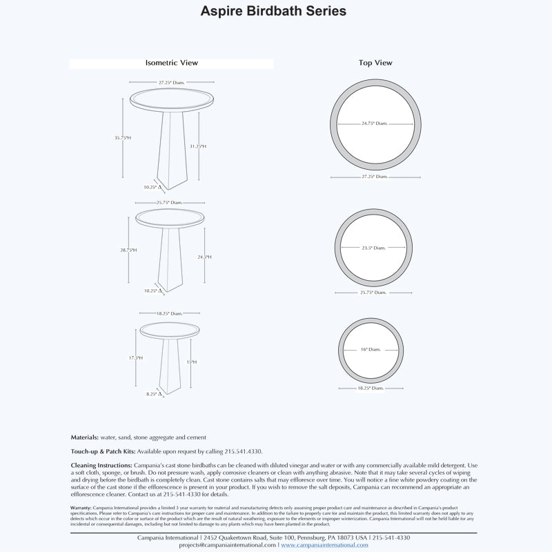 Cleaning Instructions: Campania’s cast stone birdbaths can be cleaned with diluted vinegar and water or with any commercially available mild detergent. Use a soft cloth, sponge, or brush. Do not pressure wash, apply corrosive cleaners or clean with anything abrasive. Note that it may take several cycles of wiping and drying before the birdbath is completely clean. Cast stone contains salts that may effloresce over time. You will notice a fine white powdery coating on the surface of the cast stone if the efflorescence is present in your product. If you wish to remove the salt deposits, Campania can recommend an appropriate an efflorescence cleaner.