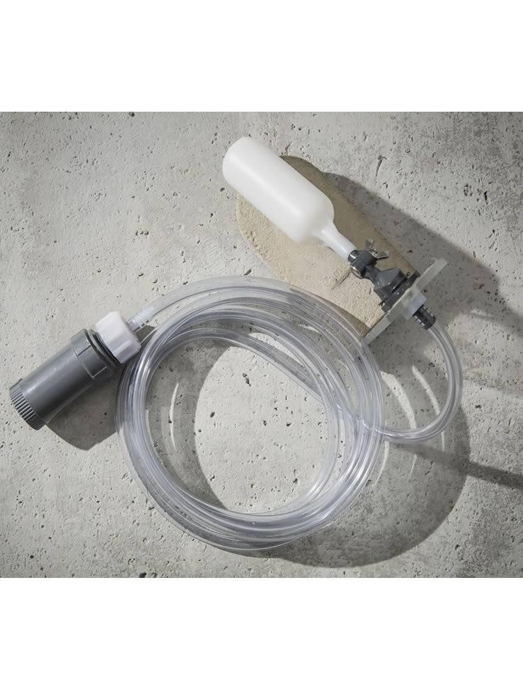 To keep a constant water level in your fountain, you can add the auto refill system. It comes with a float valve, concrete base, custom stopper, clear tubing, and a pressure relief garden hose or spigot connection. The device is connected to a garden hose or spigot, and the water is turned on and off by the valve in the unit, keeping your fountain filled effortlessly.