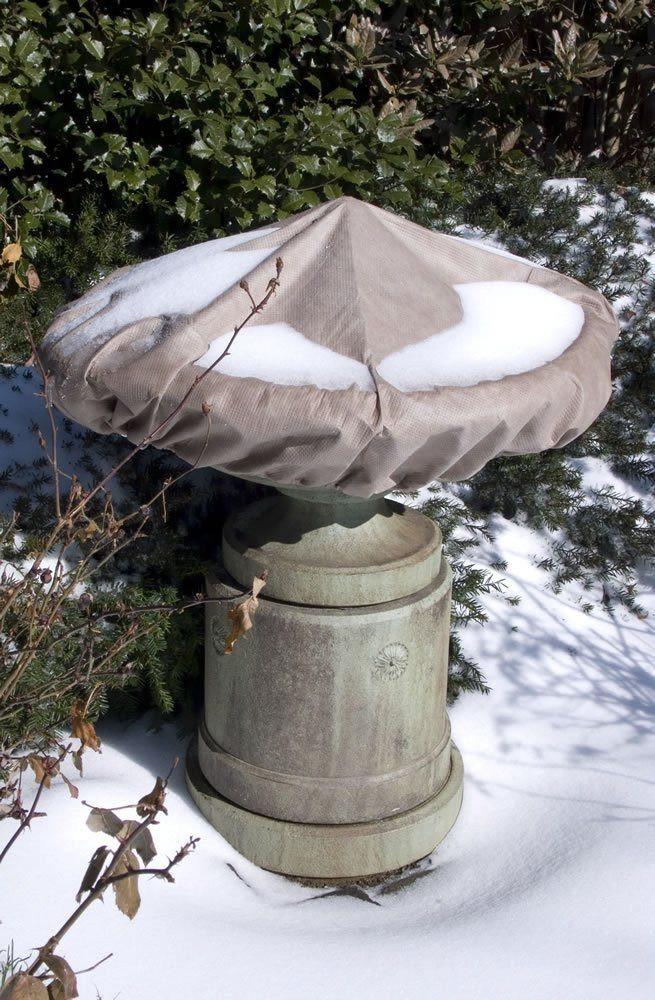 It is very important for you to protect your cast stone and pottery fountains, birdbaths, planters and statuary from the freeze-thaw cycle during the winter months. Ideally, cast stone and pottery decor that can collect water, should not be left outside when temperatures dip down to freezing. They should be stored indoors or in a dry protected place such as a covered porch or garage that is away from the elements. This is not always possible, so it is recommended that you completely dry out your decor and add a waterproof cover. This is because any cast stone or pottery component that can hold water and freeze has the potential to crack and crumble. Components such as fountain pedestals which remain in a basin/pool can also crack or crumble.