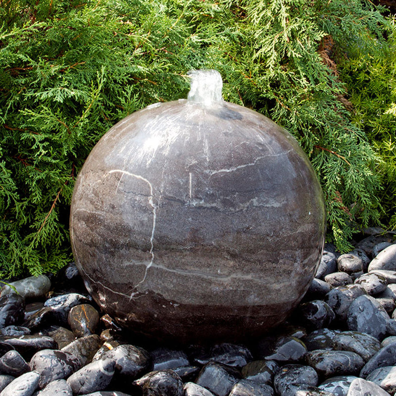 This “transitional” fountain embodies the elegance and power of simple form. Handcrafted into a sphere from rare blue limestone by skilled artisans, this fountain is a striking addition to outdoor spaces. Designed as a self-contained unit, it does away with complex plumbing and requires minimal maintenance. It is available in three sizes so you can choose which scale perfectly fits your space. For a complete look, black polished pebbles are included with purchase.