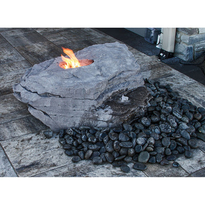 A fusion of opposing elements, the Boulder Outdoor Fire Stone Fountain is a signature of elegance and utility. This piece combines the relaxing sound of flowing water and the captivating glow of fire in a compelling sensory experience. Its GFRC construction ensures long-lasting durability, while also being substantially lighter in weight than identical "real" stone, which can weigh several hundred pounds more. It is available in Dapple Gray Rock  and Chestnut Rock finishes.