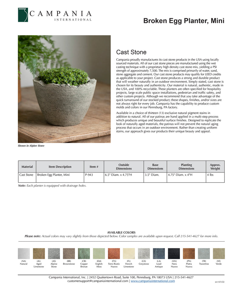 Campania proudly manufactures its cast stone products in the USA using locally sourced materials. All of our cast stone pieces are manufactured using the wet casting technique with a proprietary high density cast stone mix, yielding a PSI strength of approximately 7,500. The mix is comprised primarily of water, sand, stone aggregate and cement. Our cast stone products may qualify for LEED credits as applicable to your project. Cast stone produces a strong and durable product that will weather naturally in an outdoor environment. Simply stated, cast stone is chosen for its beauty and authenticity. Our material is natural, authentic, made in the USA, and 100% recyclable.
