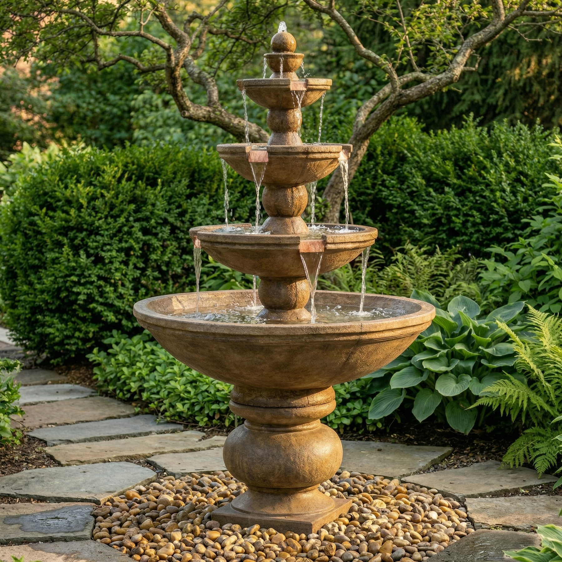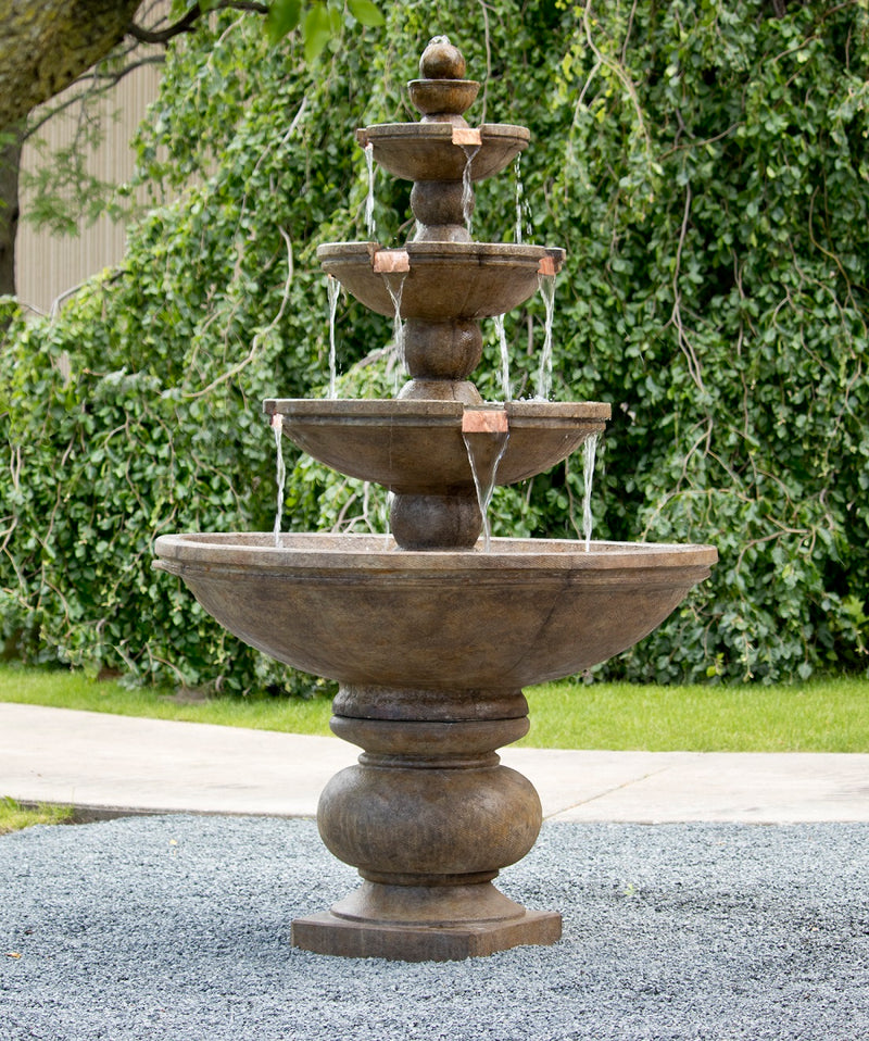 The Buckingham Four Tier Fountain features a "wide copper spill" twist on the traditional tiered fountain.