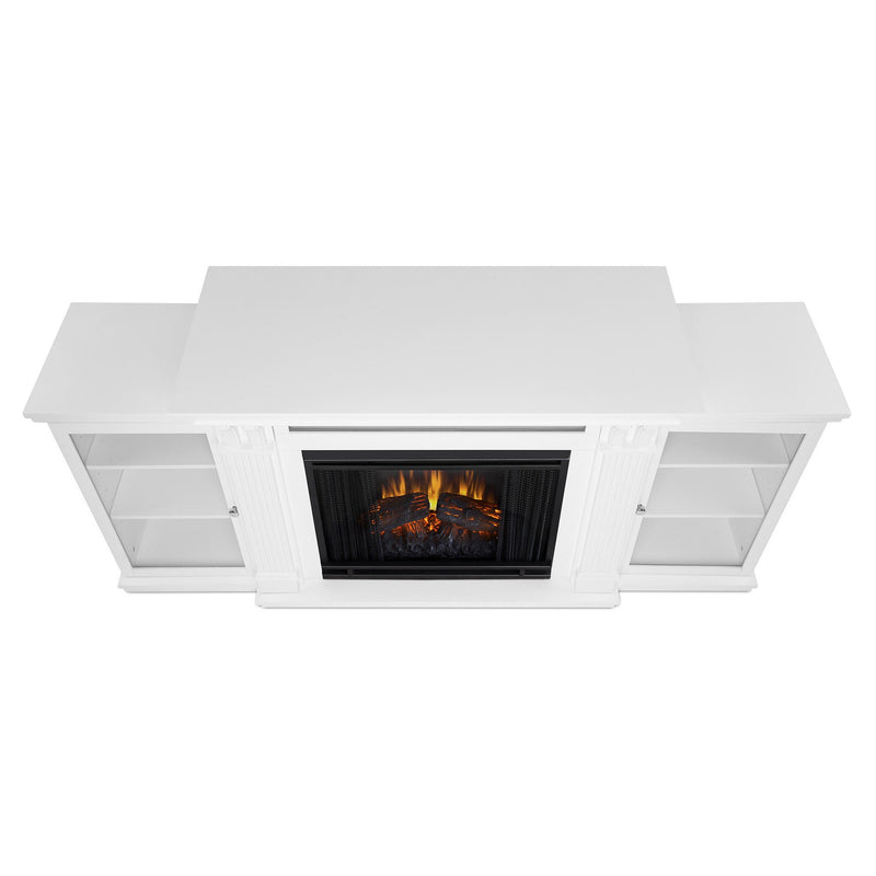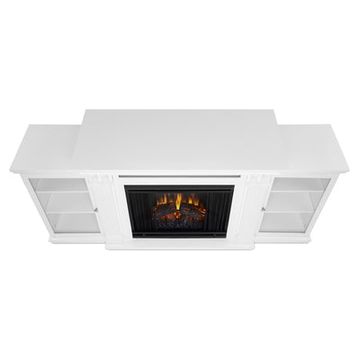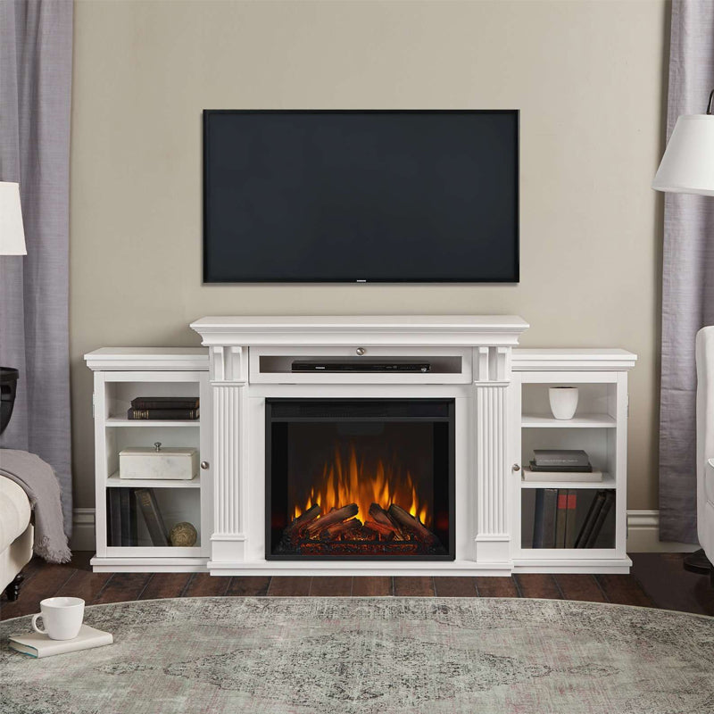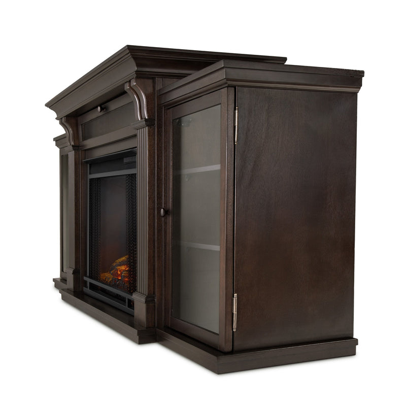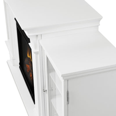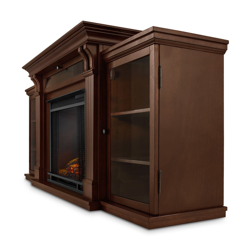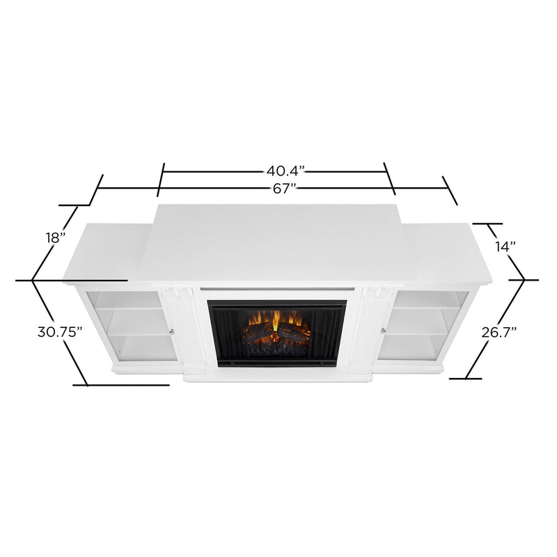 Elevate your living space to a haven of refined elegance with the Calie Electric Fireplace TV Stand (67"L x 18"W x 30.5"H, 142.5 lbs.).** Beautifully carved pilasters gracefully ascend to meet traditional corbels, casting a warm glow before the fire even flickers to life. Inside the 23.5"L x 8.75"W x 20"H (32 lbs.) Real Flame® VividFlame firebox, captivating flames dance in six mesmerizing colors, all without the fuss of a chimney. Whether you crave cozy warmth up to 1,000 sq. ft. or bask in year-round ambiance, the Calie has you covered. Crafted for both style and function, the Calie boasts a central shelf (27"L x 12.5"W x 4.5"H) with a charming drop-down glass door, flanked by dual side cabinets (13.5"L x 12"W x 23"H) featuring adjustable shelves for organized display. Showcase your treasures, curate a gallery of family photos, or simply arrange movie nights in style. Above it all, a spacious mantel (real wood finish, of course) awaits your TV up to 65".