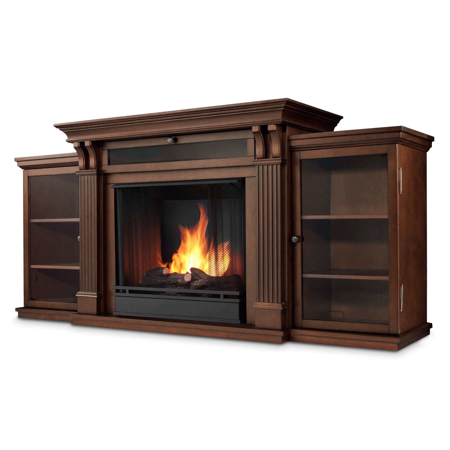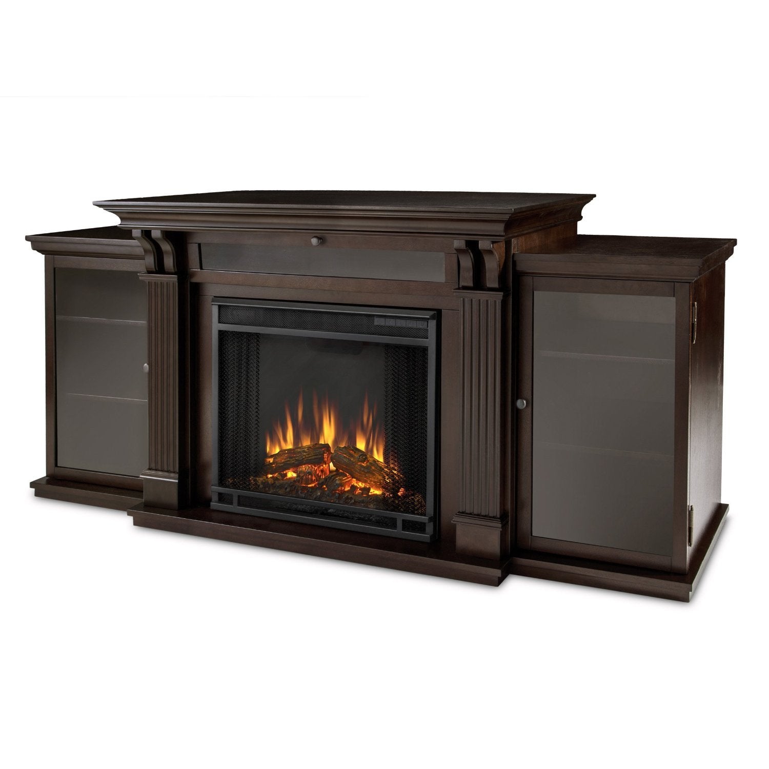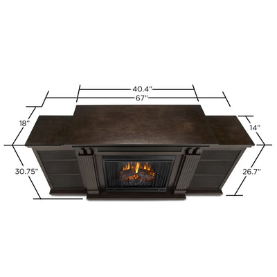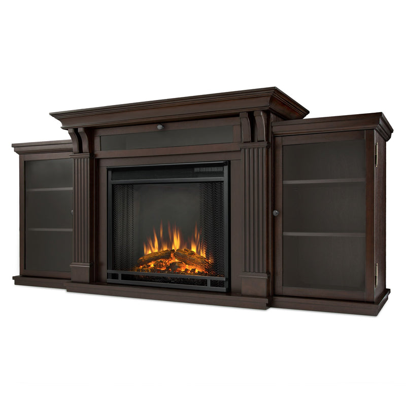 Elevate your living space to a haven of refined elegance with the Calie Electric Fireplace TV Stand (67"L x 18"W x 30.5"H, 142.5 lbs.).** Beautifully carved pilasters gracefully ascend to meet traditional corbels, casting a warm glow before the fire even flickers to life. Inside the 23.5"L x 8.75"W x 20"H (32 lbs.) Real Flame® VividFlame firebox, captivating flames dance in six mesmerizing colors, all without the fuss of a chimney. Whether you crave cozy warmth up to 1,000 sq. ft. or bask in year-round ambiance, the Calie has you covered. Crafted for both style and function, the Calie boasts a central shelf (27"L x 12.5"W x 4.5"H) with a charming drop-down glass door, flanked by dual side cabinets (13.5"L x 12"W x 23"H) featuring adjustable shelves for organized display. Showcase your treasures, curate a gallery of family photos, or simply arrange movie nights in style. Above it all, a spacious mantel (real wood finish, of course) awaits your TV up to 65".