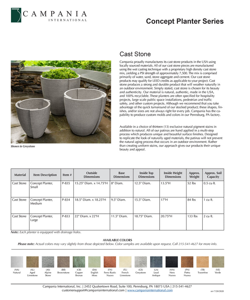 Campania proudly manufactures its cast stone products in the USA using locally sourced materials. All of our cast stone pieces are manufactured using the wet casting technique with a proprietary high density cast stone mix, yielding a PSI strength of approximately 7,500. The mix is comprised primarily of water, sand, stone aggregate and cement. Our cast stone products may qualify for LEED credits as applicable to your project. Cast stone produces a strong and durable product that will weather naturally in an outdoor environment. Simply stated, cast stone is chosen for its beauty and authenticity. Our material is natural, authentic, made in the USA, and 100% recyclable.
