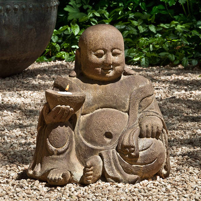 Create a cheerful yet relaxing outdoors with Campania's Dancing Buddha. This joyful cast stone version of Buddha seems to twirl in delight as he hold a lotus flower in each hand upwards. Made of durable cast stone and comes in several rich colors, this garden statue can blend into any natural setting, or display indoors for a wonderful home accent piece.