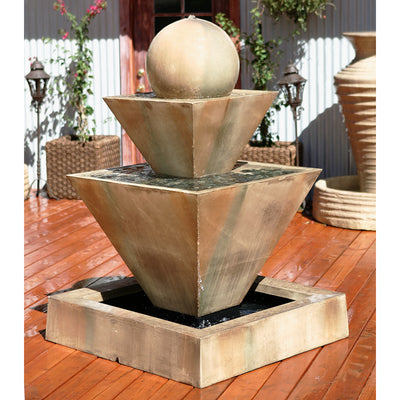Give your open-air space an advanced, eye-catching highlight with the Double Oblique Outdoor Fountain with its modern fountain style and clean lines. This garden fountain features two tiers of water cascading down the face and into the pool below and topped by a large sphere for extra interest.