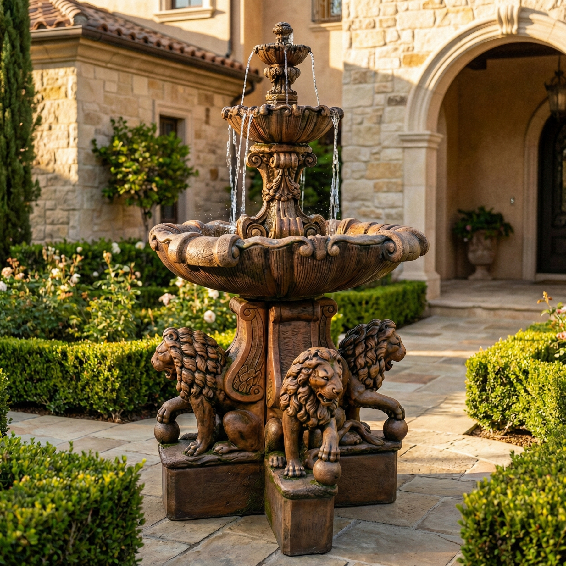 Extra Large Vesuvio Fountain with Lion Pedestals has an elegant water flow, great sound that will enhance the beauty of your outdoor space. It features a round pool shaped like a flower with three playful lion below. This fountain is made from durable cast stone and is available in a wide variety of finishes.