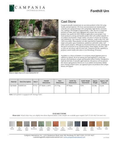 Campania proudly manufactures its cast stone products in the USA using locally sourced materials. All of our cast stone pieces are manufactured using the wet casting technique with a proprietary high density cast stone mix, yielding a PSI strength of approximately 7,500. The mix is comprised primarily of water, sand, stone aggregate and cement. Our cast stone products may qualify for LEED credits as applicable to your project. Cast stone produces a strong and durable product that will weather naturally in an outdoor environment. Simply stated, cast stone is chosen for its beauty and authenticity. Our material is natural, authentic, made in the USA, and 100% recyclable.