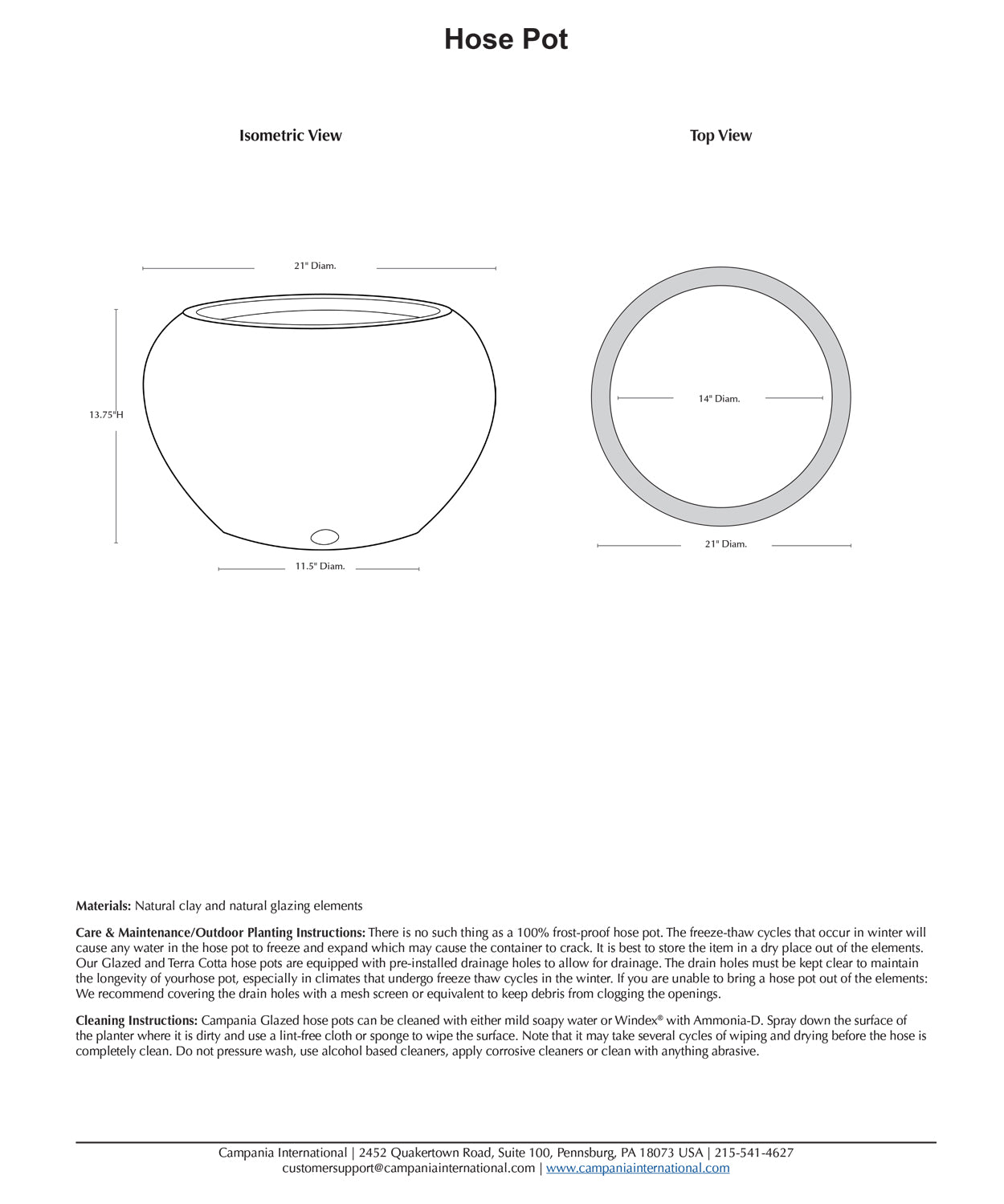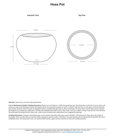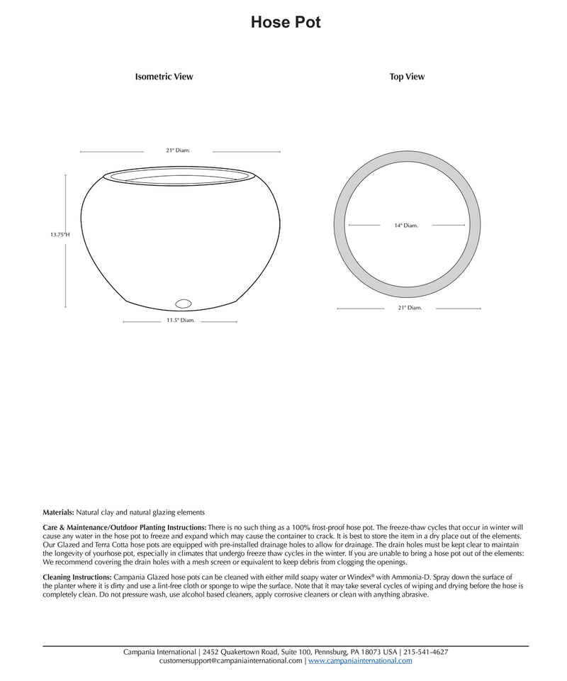 Cleaning Instructions: Campania Glazed hose pots can be cleaned with either mild soapy water or Windex® with Ammonia-D. Spray down the surface of the planter where it is dirty and use a lint-free cloth or sponge to wipe the surface. Note that it may take several cycles of wiping and drying before the hose is completely clean. Do not pressure wash, use alcohol based cleaners, apply corrosive cleaners or clean with anything abrasive.
