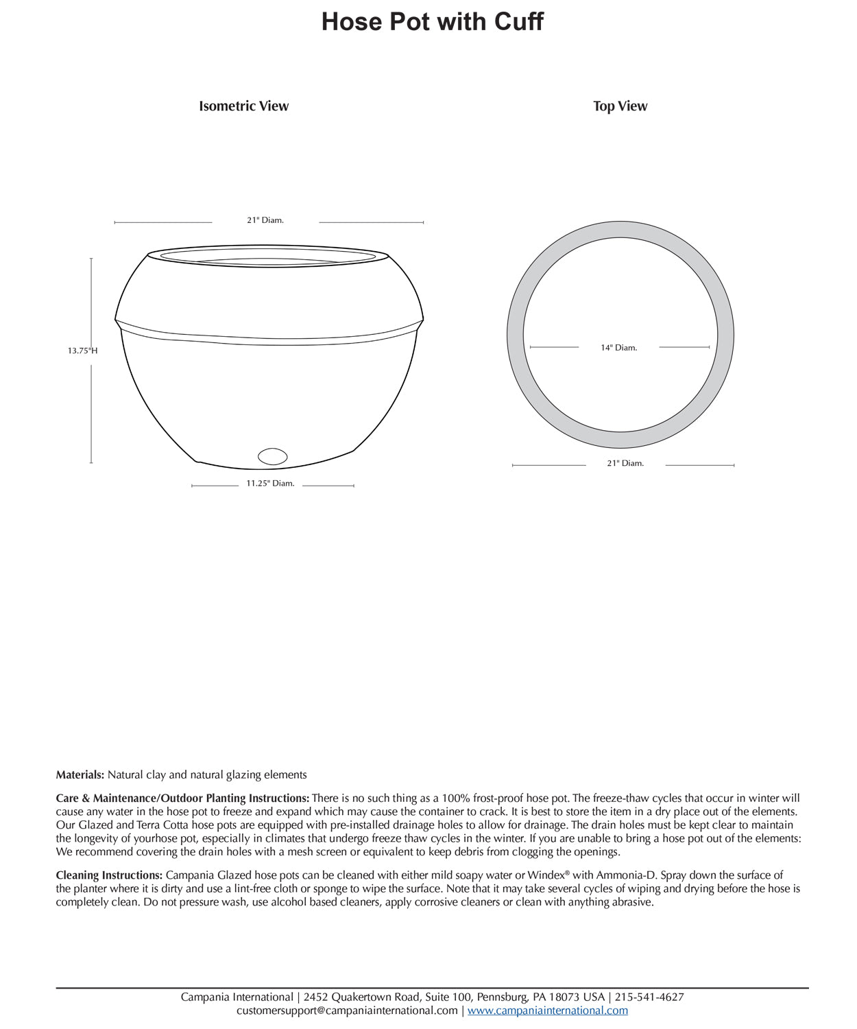 Cleaning Instructions: Campania Glazed hose pots can be cleaned with either mild soapy water or Windex® with Ammonia-D. Spray down the surface of the planter where it is dirty and use a lint-free cloth or sponge to wipe the surface. Note that it may take several cycles of wiping and drying before the hose is completely clean. Do not pressure wash, use alcohol based cleaners, apply corrosive cleaners or clean with anything abrasive.