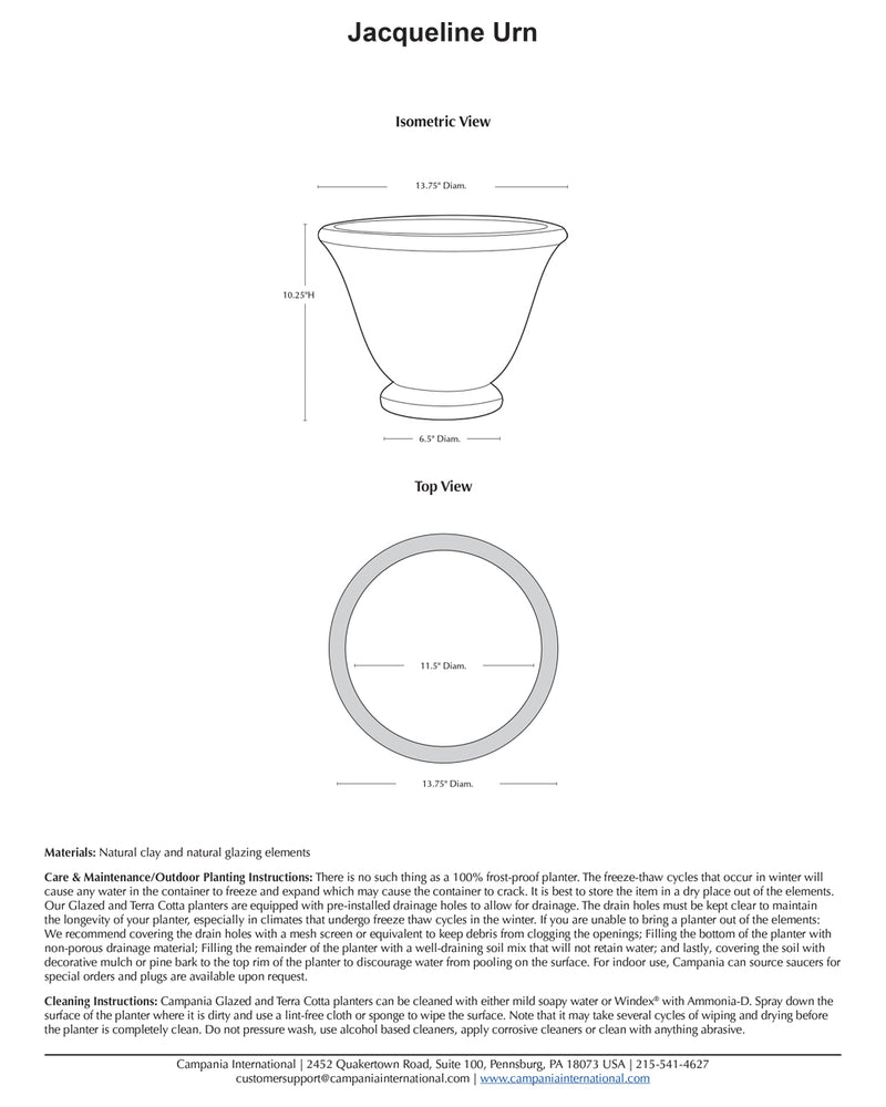 Cleaning Instructions: Campania Glazed and Terra Cotta planters can be cleaned with either mild soapy water or Windex® with Ammonia-D. Spray down the surface of the planter where it is dirty and use a lint-free cloth or sponge to wipe the surface. Note that it may take several cycles of wiping and drying before the planter is completely clean. Do not pressure wash, use alcohol based cleaners, apply corrosive cleaners or clean with anything abrasive.