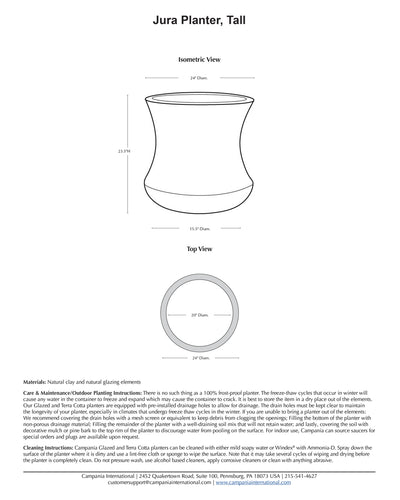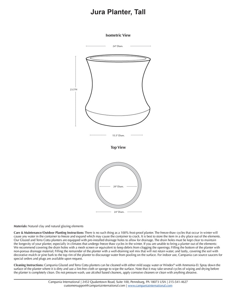 Cleaning Instructions: Campania Glazed and Terra Cotta planters can be cleaned with either mild soapy water or Windex® with Ammonia-D. Spray down the surface of the planter where it is dirty and use a lint-free cloth or sponge to wipe the surface. Note that it may take several cycles of wiping and drying before the planter is completely clean. Do not pressure wash, use alcohol based cleaners, apply corrosive cleaners or clean with anything abrasive.