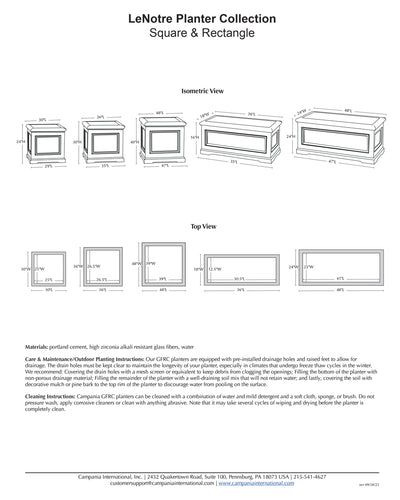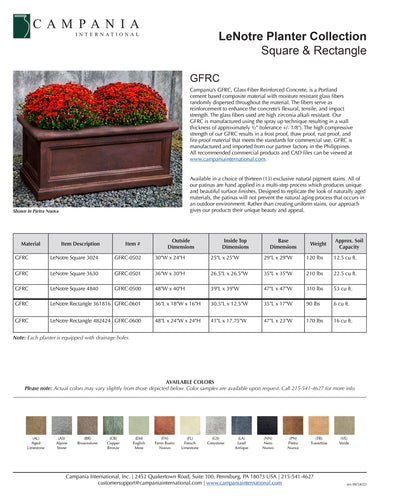 NOTE: The finishes are designed to replicate the look of natural aging, but unlike a painted finish, the patinas do not prevent the natural aging process. Any cast stone item with a patina finish will weather naturally in an outdoor environment. Because each patina is hand applied in a multi-step process and the product is photographed in natural settings, actual colors may vary.