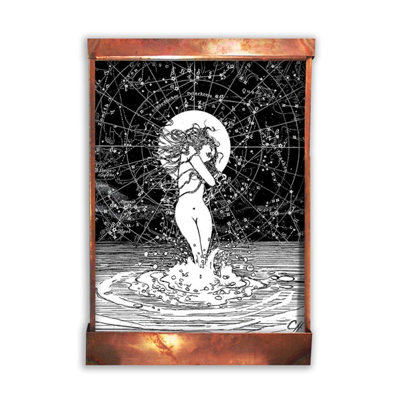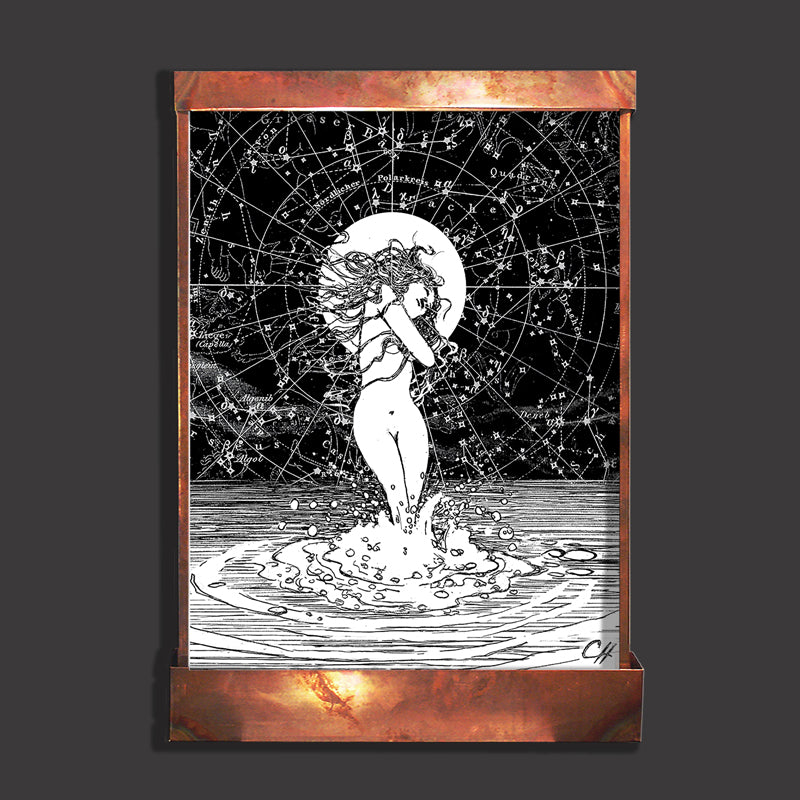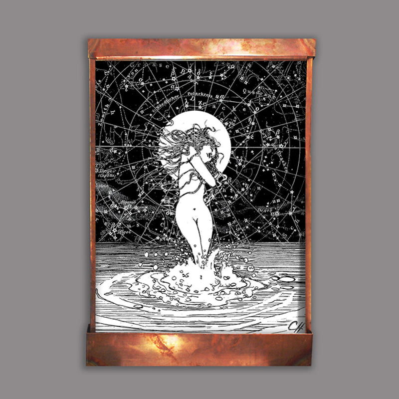 So what is a Naiad you ask? It is a lesser goddess of rivers, streams, or oceans from Greek mythology. They are wild and free, magical and untamed. This one can be in your home or office as a source of beauty and mystery. Behind her you can see a map of the constellations which add a lovely filigree to the piece. An LED light hood can be added to the piece. As it is, it comes with a pump and all the hardware you need to hang it. This one is 48" tall, 33" wide, and 5" deep, but we can make her to any size that you might need.