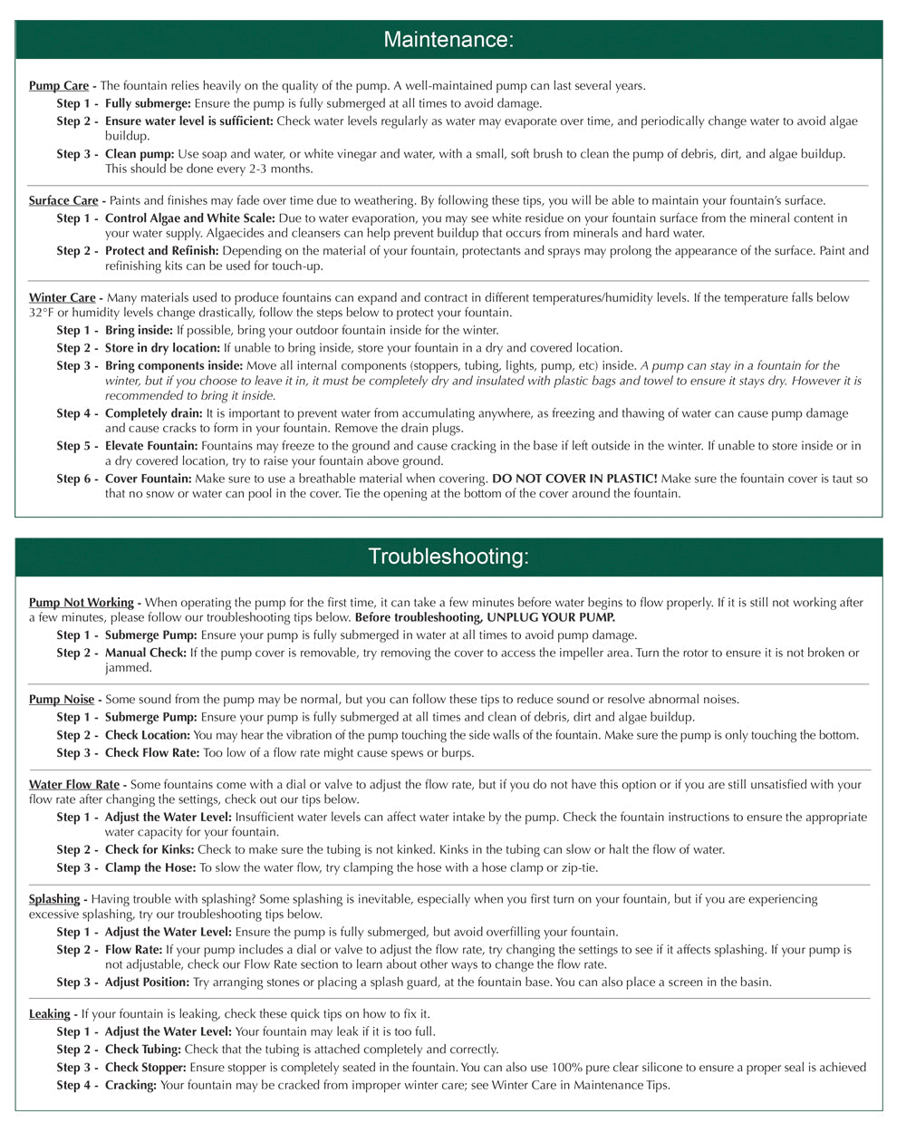 For information on how to winterize your outdoor fountain Click HereFor information on how to remove algae from your fountain Click Here