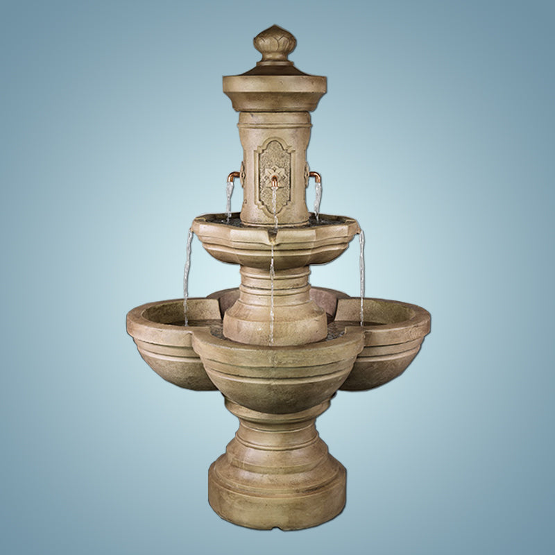 This outdoor fountain is available in 17 Different Finishes. Every finish is hand applied during the production process so color variation is expected. When the finish is applied to the water feature it is designed to replicate the look of naturally aged materials.