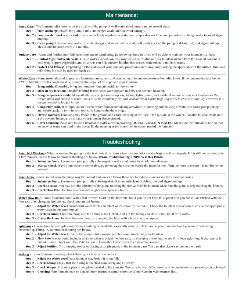 For information on how to winterize your outdoor fountain Click HereFor information on how to remove algae from your fountain Click Here