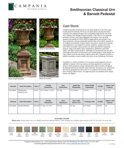 Campania proudly manufactures its cast stone products in the USA using locally sourced materials. All of our cast stone pieces are manufactured using the wet casting technique with a proprietary high density cast stone mix, yielding a PSI strength of approximately 7,500. The mix is comprised primarily of water, sand, stone aggregate and cement. Our cast stone products may qualify for LEED credits as applicable to your project. Cast stone produces a strong and durable product that will weather naturally in an outdoor environment. Simply stated, cast stone is chosen for its beauty and authenticity. Our material is natural, authentic, made in the USA, and 100% recyclable.
