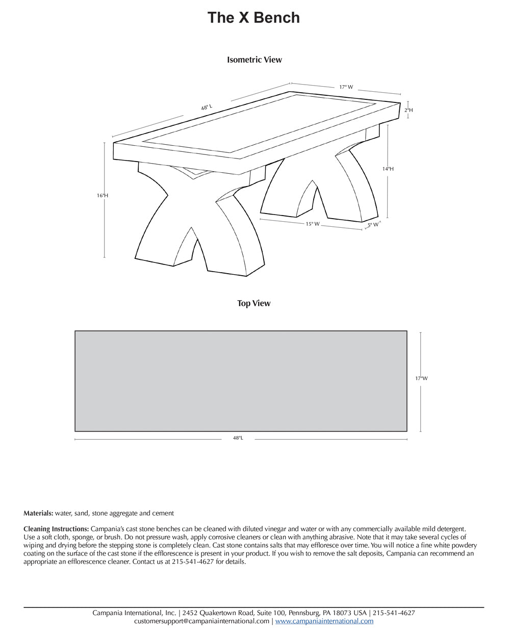 Cleaning Instructions: Campania’s cast stone benches can be cleaned with diluted vinegar and water or with any commercially available mild detergent. Use a soft cloth, sponge, or brush. Do not pressure wash, apply corrosive cleaners or clean with anything abrasive. Note that it may take several cycles of wiping and drying before the birdbath is completely clean. Cast stone contains salts that may effloresce over time. You will notice a fine white powdery coating on the surface of the cast stone if the efflorescence is present in your product. If you wish to remove the salt deposits, Campania can recommend an appropriate an efflorescence cleaner.