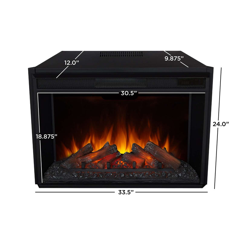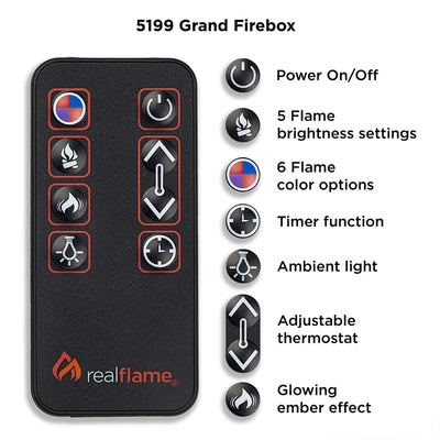 Upgrade your space with effortless elegance and organization: the Tracey Grand Electric Fireplace TV Stand (Distressed White or Black) is as functional as it is captivating. This media maestro (83.75"L x 18"W x 34.5"H) boasts an open central shelf (44.5"L x 13.5"W x 7"H) and adjustable side shelves (13.5"L x 13"W x 26.75"H) behind glass doors, keeping cords and clutter tamed while showcasing your treasures. But the magic truly ignites within. Immerse yourself in the mesmerizing dance of the Real Flame® VividFlame Grand Series firebox, featuring six captivating flame colors and five brightness levels, all controlled from the comfort of your remote. No chimney woes – just plug it in and let the warmth envelop your space (up to 1,000 sq. ft. with its 5,100 BTUs) or savor the year-round ambiance without the heat. Crafted with a real wood mantel for a touch of warmth, the Tracey boasts an adjustable thermostat, timer function, and automatic safety shut-off for peace of mind. Mantel, firebox with log set, hardware, and remote control are all included. Tracey: where function meets timeless charm, organization meets cozy comfort. Let this masterpiece elevate your space and ignite the magic of effortless living.