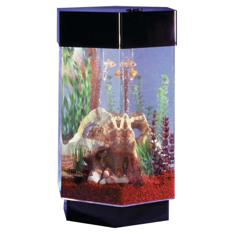 The Midwest Tropical TT-800 Hexagon Aqua Scape is an elegant hexagon tabletop aquascape that can be viewed in any angle. It is designed for a natural interior beautiful sea scapes. It comes with pump, lighting, decorative plants and under-gravel filter. This beautiful aquarium is made of ultra durable acrylic material that last longer. It is easy to maintain and can be place on the desks.
