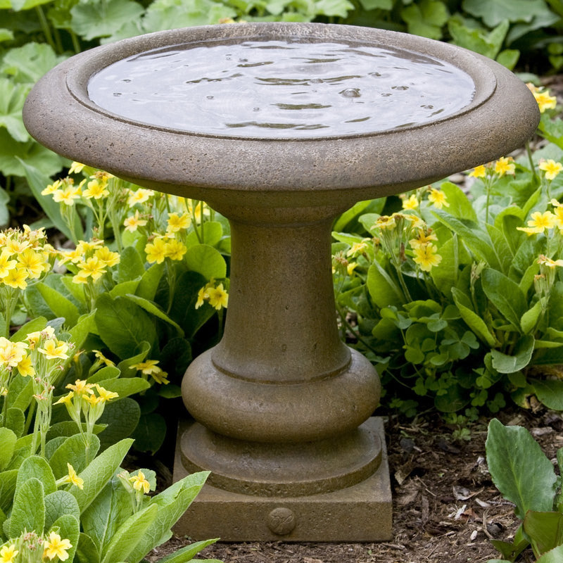 Cleaning Instructions: Campania’s cast stone birdbaths can be cleaned with diluted vinegar and water or with any commercially available mild detergent. Use a soft cloth, sponge, or brush. Do not pressure wash, apply corrosive cleaners or clean with anything abrasive. Note that it may take several cycles of wiping and drying before the birdbath is completely clean. Cast stone contains salts that may effloresce over time. You will notice a fine white powdery coating on the surface of the cast stone if the efflorescence is present in your product. If you wish to remove the salt deposits, Campania can recommend an appropriate an efflorescence cleaner.